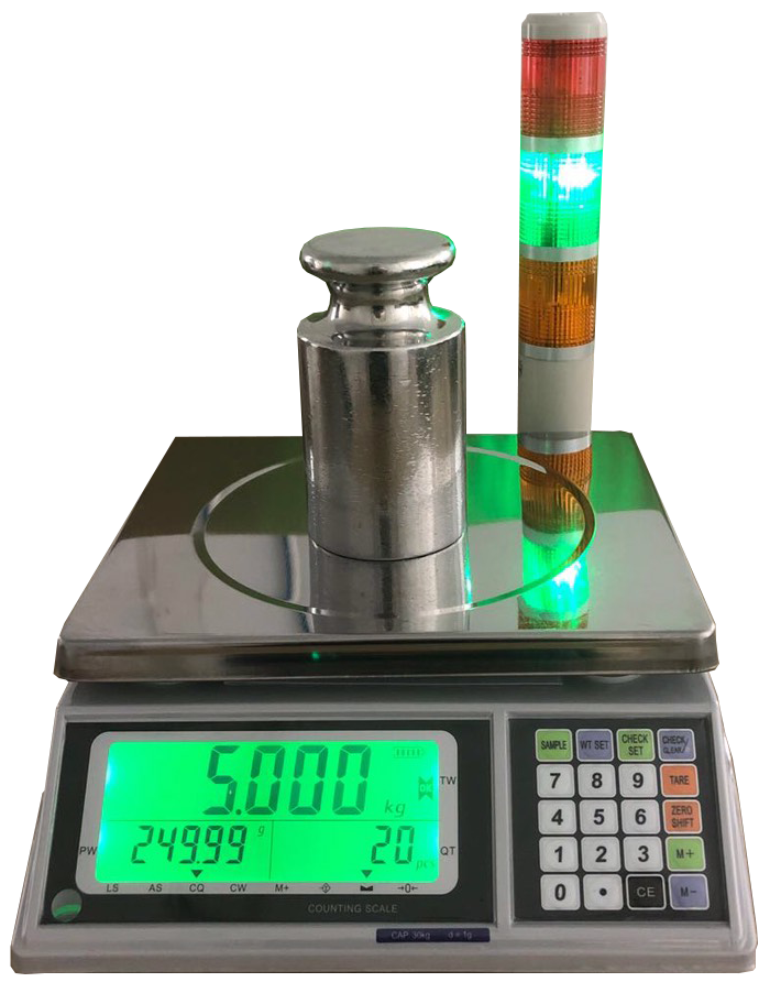 - Đèn cảnh báo 3 màu (xanh, vàng, đỏ) tích hợp còi phát ra âm thanh cảnh báo lắp liền với cân, cao 130mm.