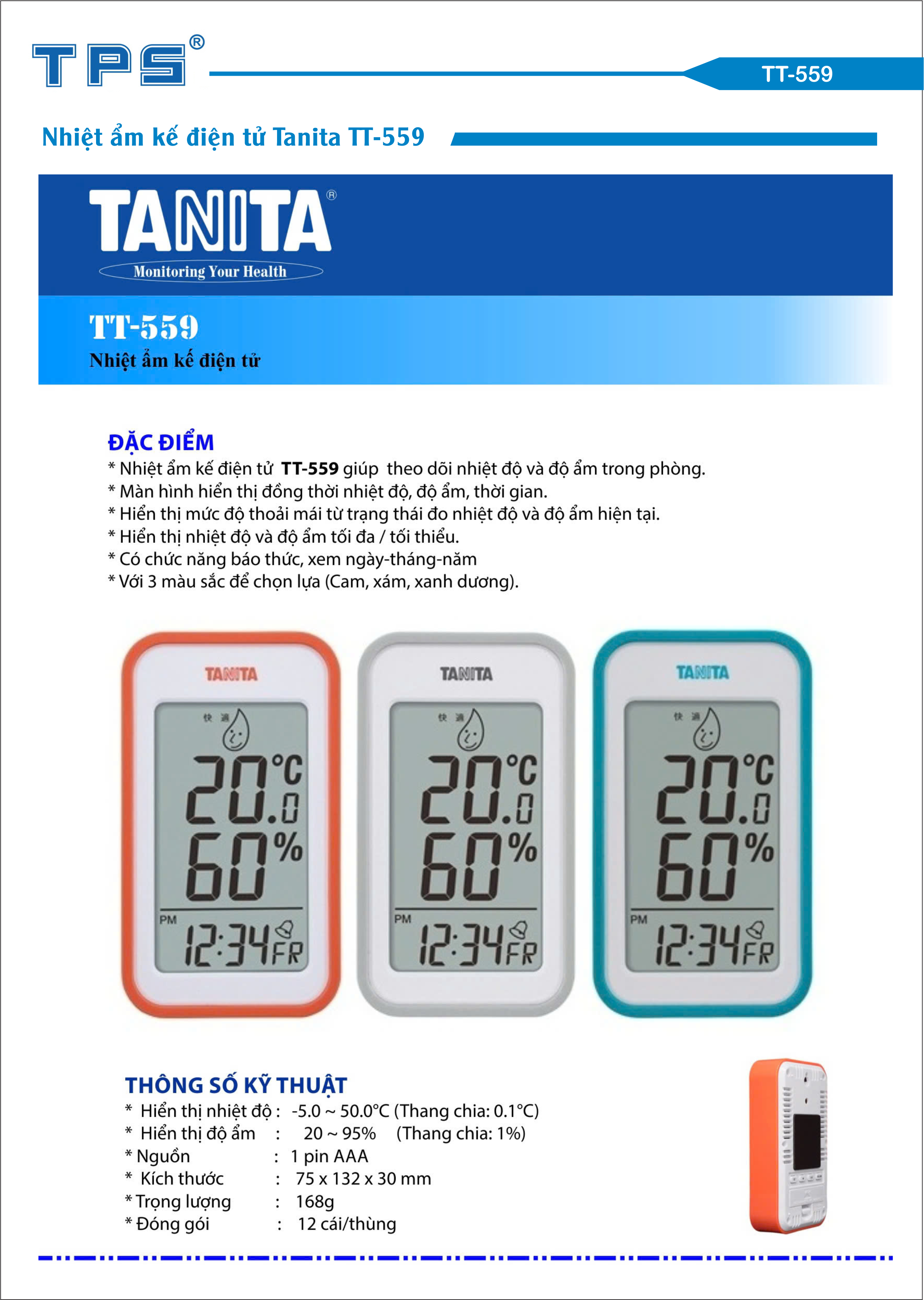 - Nhiệt ẩm kế điện tử Tanita TT-559 với thiết kế sang trọng, độ chính xác cao, có thể treo ở tường hoặc đặt bàn. Sản phẩm thích hợp cho các phòng thí nghiệm, văn phòng và gia đình, các trang trại chăn nuôi, nuôi cấy mô...