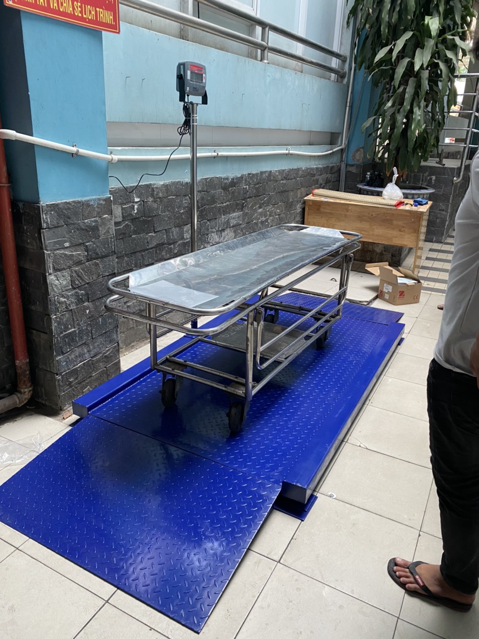 + Kết cấu khung thép được sơn tĩnh điện công nghệ cao, chống ăn mòn cao, thiết kế có 2 bề dốc lên và xuống thuận tiện cho bệnh nhân có thể nằm trên băng ca vẫn có thể cân được.