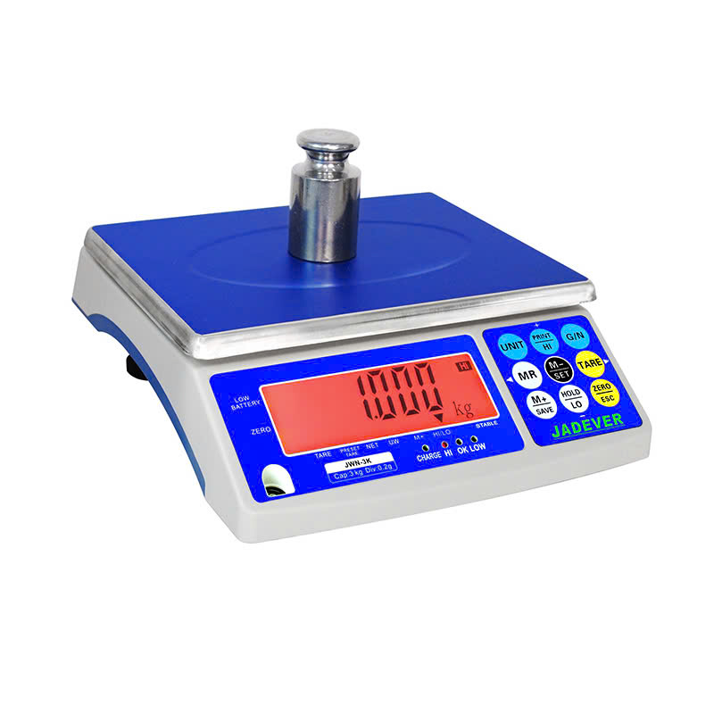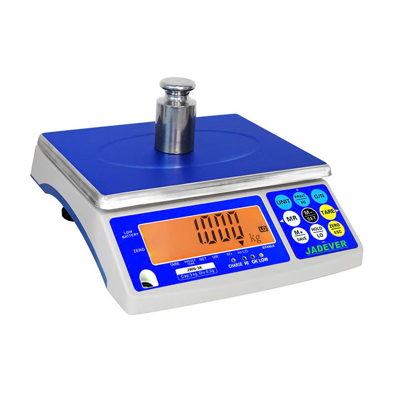 - Cân điện tử JWN-3K là mẫu cân thông dụng có độ chính xác đến từng gram ứng dụng trong nhiều ngành như: Cân định lượng, cân trừ bì, cân cộng dồn, cảnh báo giới hạn trên/dưới, cân sử dụng cho sản xuất, đóng gói, kiểm kê, cảm ứng lực điện từ bên dưới. Kết quả hiển thị bằng màn hình LCD lớn, độ tương phản cao với đèn nền sáng màu xanh lá cây dễ dàng thao tác và quan sát.