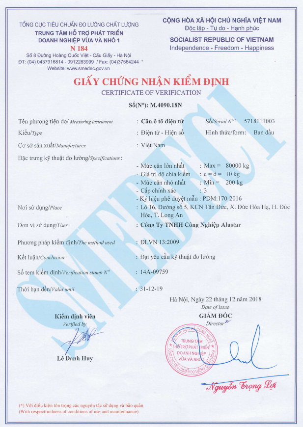 Mẫu giấy chứng nhận kiểm định cân ô tô.