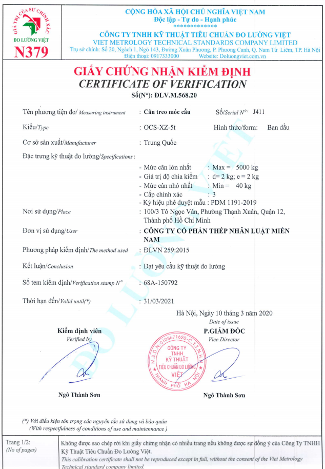 Chu kỳ kiểm định của cân treo móc cẩu là: 12 tháng.