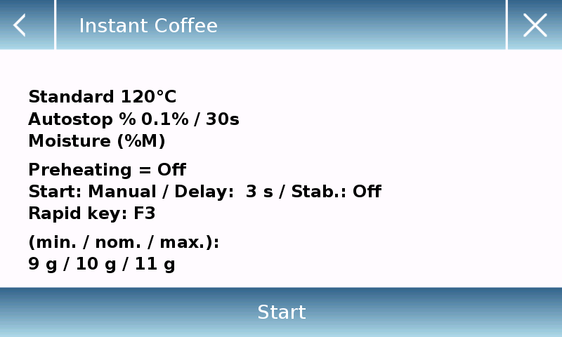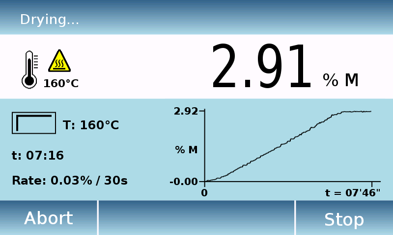 - Drying modes:Time mode (1-99 min.),Autostop % or absolute autostop in grams, Manual