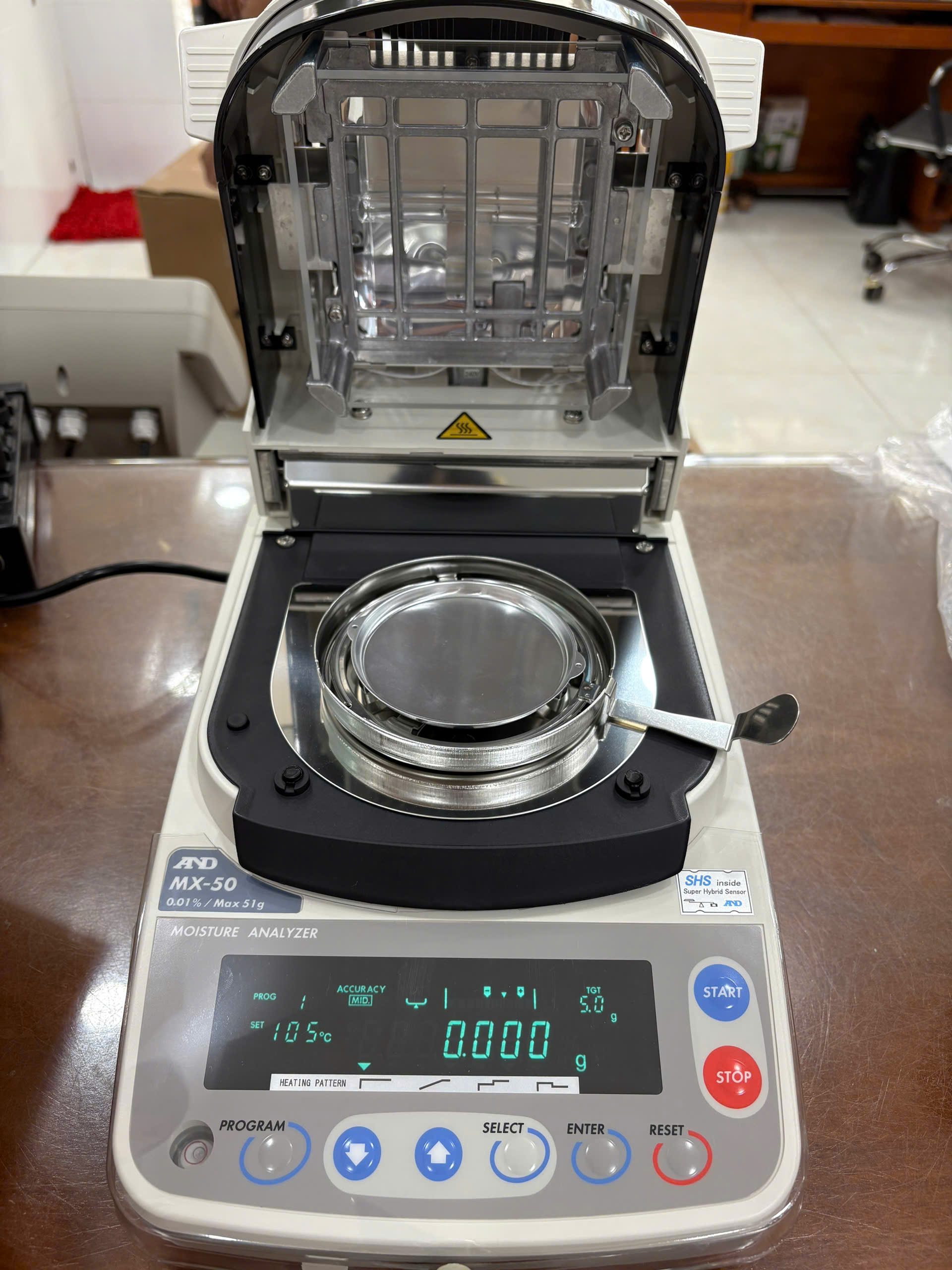 - Hiển thị: Màn hình VFD có đèn nền, hiển thị các thông số: % độ ẩm, % chất rắn hoặc trọng lượng, nhiệt độ, thời gian.