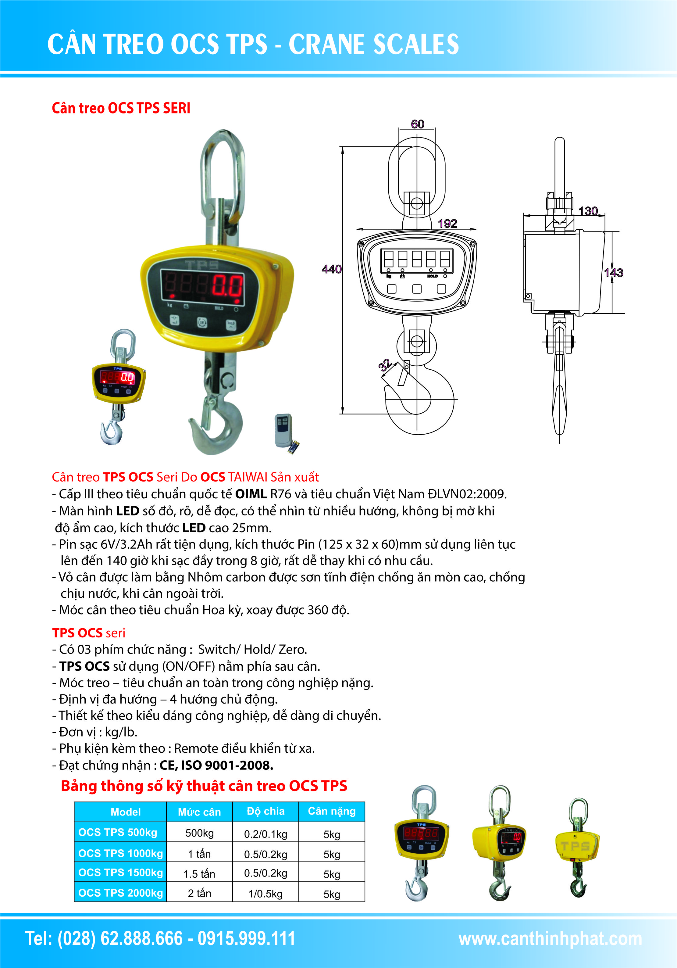 - Cân treo OCS TPS là mẫu cân treo thông dụng ứng dụng nhiều trong ngành công nghiệp với tiêu chuẩn an toàn cao, đặc biệt ứng dụng cho ngành sắt thép công nghiệp nặng. Với móc cân phía dưới có thể xoay 360 độ để chống va đập, cân có remote dùng đều kiển khi cân ở trên cao, vỏ cân làm bằng nhôm chống nhiễu tốt với các thiết bị khác nhằm tránh sai lệch giá trị cân. Cân kèm theo pin sạc 6V/3.2ah pin lớn có thể sử dụng trong nhiều ngày liên tục