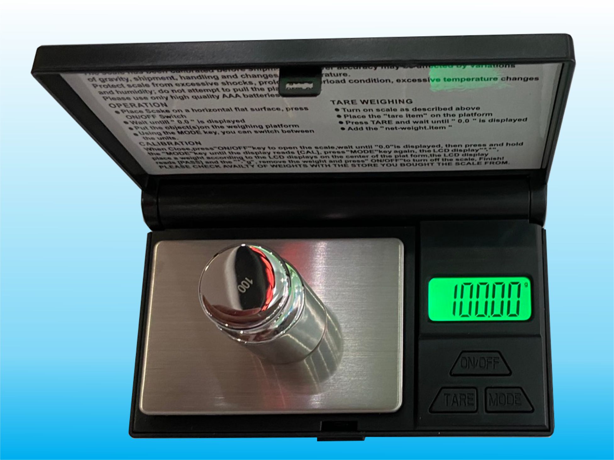 - Khởi động nguồn bằng phím "ON/OFF", màn hình chỉ hiện thị “0.00g”.
